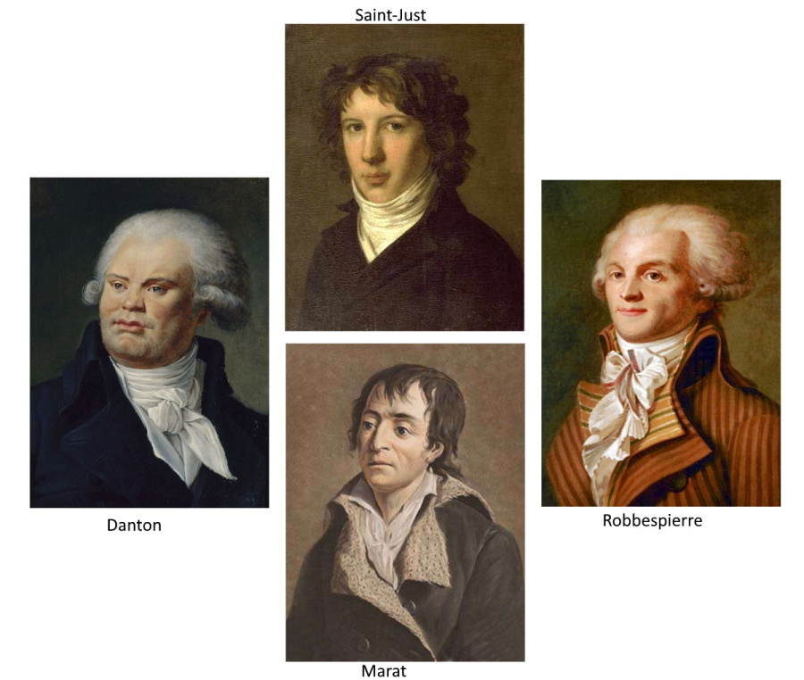 Im Gegensatz zur vorstehenden Viererbande war die jakobinische des Terrors aufgrund der sich überstürzenden Ereignisse nur sehr kurzlebig, entspricht daher nicht ganz meinen Definitionen, und ist deshalb im Bewusstsein der Nachwelt zu einer virtuellen geworden. Die viertemperamentige Bande ist also nicht unbedingt die Garantie auf Langlebigkeit. Die nicht nachhaltige Zielsetzung der Jakobiner folgte einem religiösen Impuls der Säuberung und des jüngsten Gerichts: die Mächte des Lichts (Aufklärung, Rationalität, Gerechtigkeit, Wahrheit) gegen die Mächte der Finsternis (Adel, Klerus, Korruption, Lüge), der Terror der Tugend gegen den Terror des Lasters. So will die Bande die Bösen vernichten, damit nur die Guten übrigbleiben. Der Weg dahin folgt dem üblichen Muster: radikal, radikaler, am radikalsten. Neu ist nur, dass man nicht mehr mit Lustgewinn mordet, sondern streng rationell (Guillotine), ohne Foltergeilheit wie in früheren Zeiten. Das Morden wurde bürokratisch, wo die Zahl zur Messlatte des Erfolgs wird. Die Antreiber, alle Männer des Geistes sind auch die Getriebenen: Saint-Just, der Todesengel, ein erfolgloser Schriftsteller, aber sprachgewaltiger Ankläger (+ +); Marat, von Krankheiten gezeichneter Schmerzens-mann, ein verkrachter Wissenschaftler und Zahlenfetischist, Herausgeber des Hetzmagazins „Volksfreund“ (-- --); Danton, Advokat, begnadeter Volksredner und genussfreudiger Lebemann (-- +); Robbespierre, der furchtbare Jurist, asketischer Gerechtigkeits- und Tugendfanatiker, der fähige Planer und Organisator der Schreckensherr-schaft (+ --).