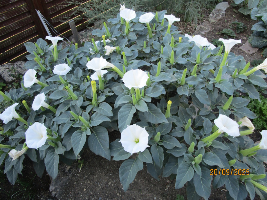 Im Jahr 2022 hatte es zwischenzeitlich im Sommer ausgiebig geregnet. So wucherten die Sämlinge über die Mauer mit den Kakteen hinaus in meine Pergola. Die Datura am Ursprungsort blieben kümmerlicher und wurden früh unansehnlich. Die stark zehrenden Pflanzen hatten ihr Revier ausgelaugt. Foto vom 19.11.22 kurz vor dem ersten Frost.